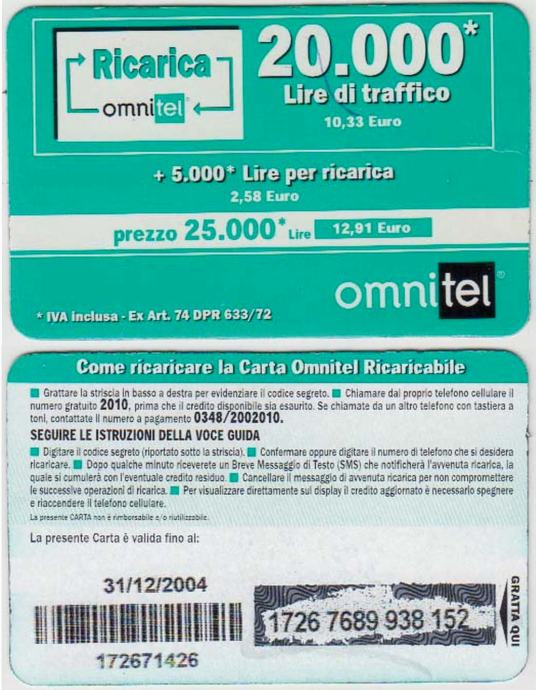 ITALIJA ITALY 92 OMNITEL BON ZA MOBITEL 20 000 L 31/12/2004