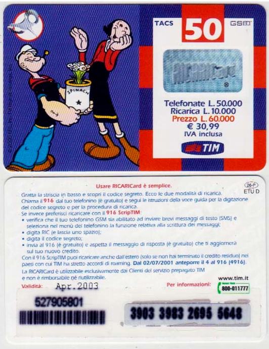 ITALIJA ITALY BON ZA MOBITEL 222A RICARICARD TIM BR 26-P Apr. 2003