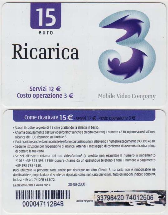 ITALIJA ITALY RICARICA 3 BON ZA MOBITEL 15 E 30-09-2008