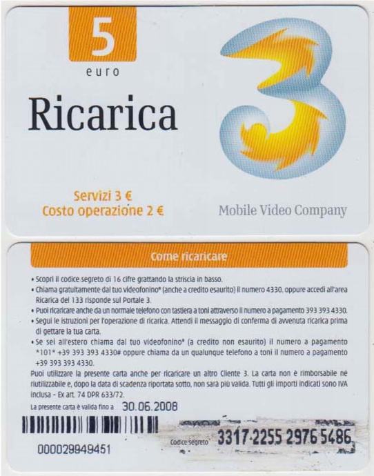 ITALIJA ITALY RICARICA 3 BON ZA MOBITEL 5 E 30.06.2008