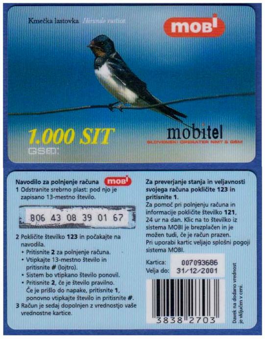 SLOVENIJA SLOVENIA 06 BON PTICE 1.000 SIT KMEČKA LASTOVKA 31/12 /2001