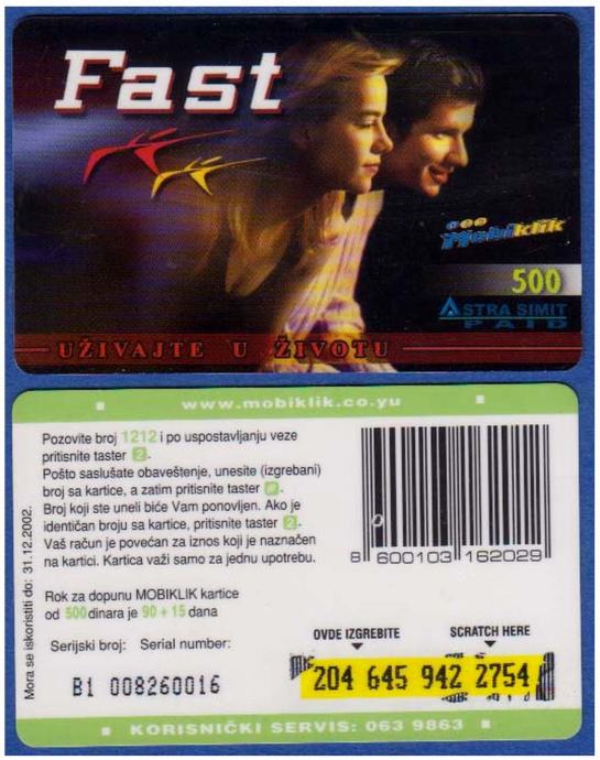 SRBIJA SERBIA BON ZA MOBITEL 500 DIN.MOBI KLIK FAST 31.12.2002.