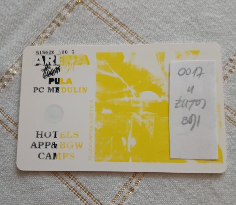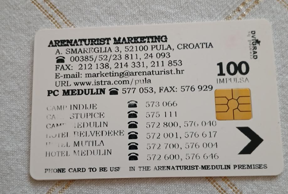 Tel.kartica Arenaturist 100 impulsa sa čipom na reversu desno .Abers sa greškom u žutoj boji.