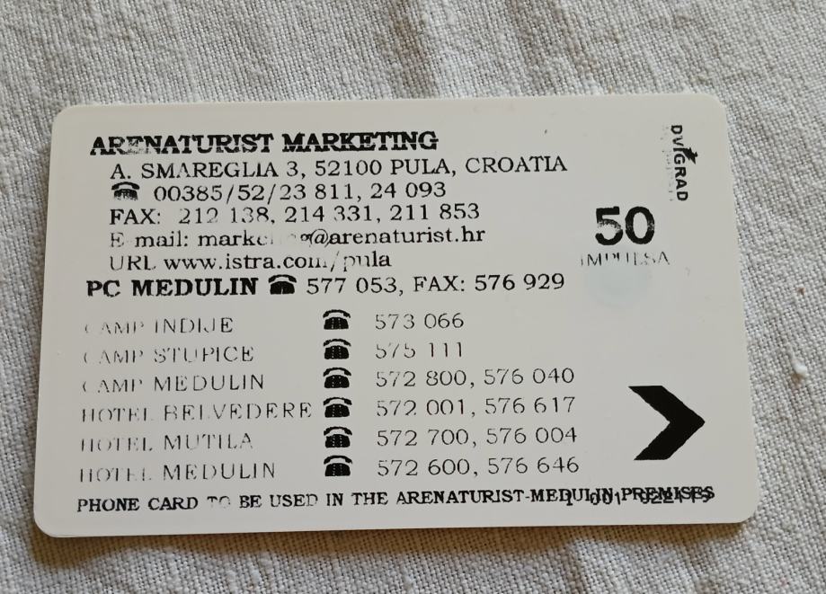 Tel.kartica Uljanik 100 impulsa, a na reversu Arenaturist 50 impulsa.