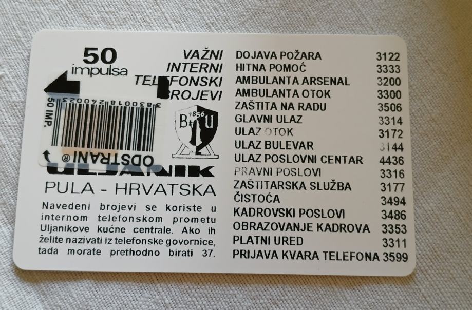 Tel.kartica Uljanik 50 impulsa, crno bijele boje.