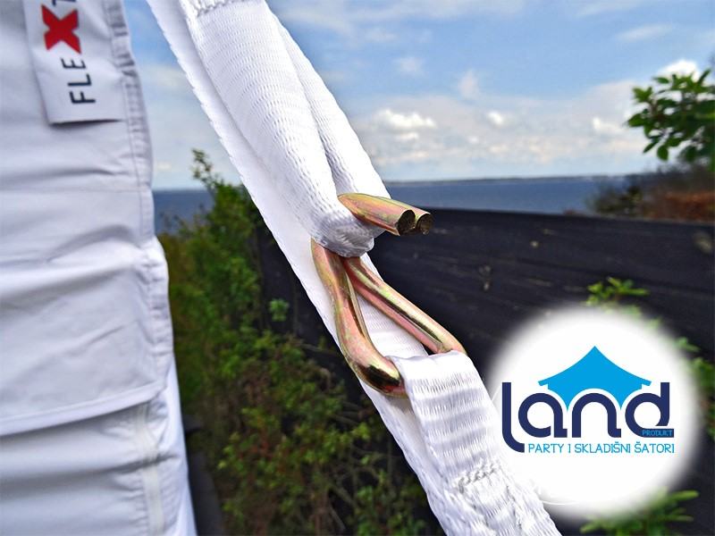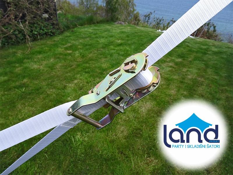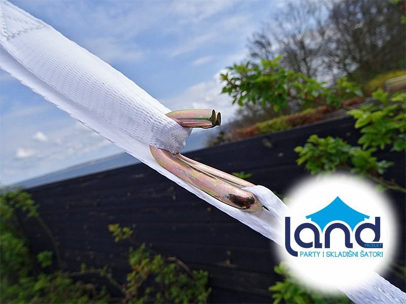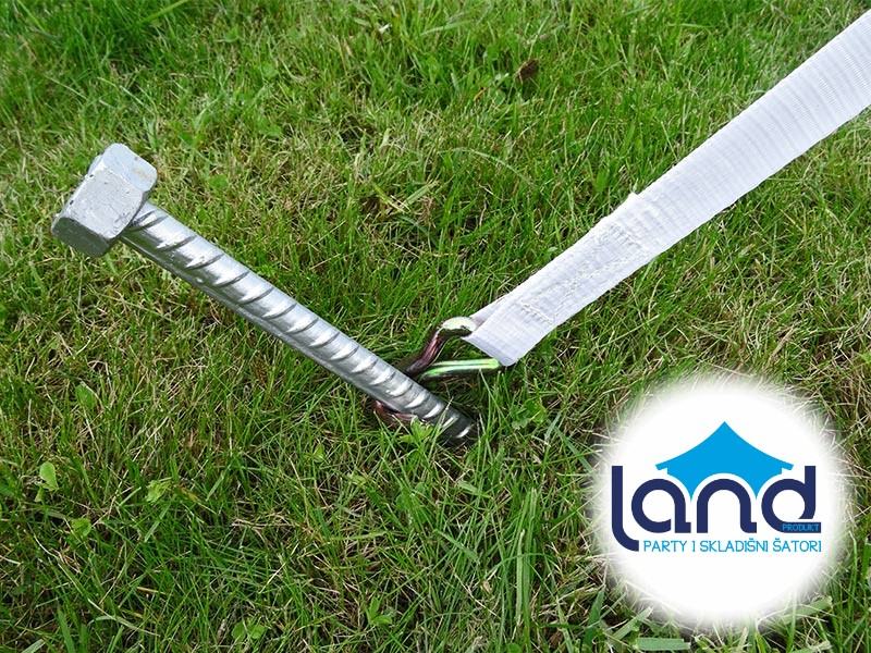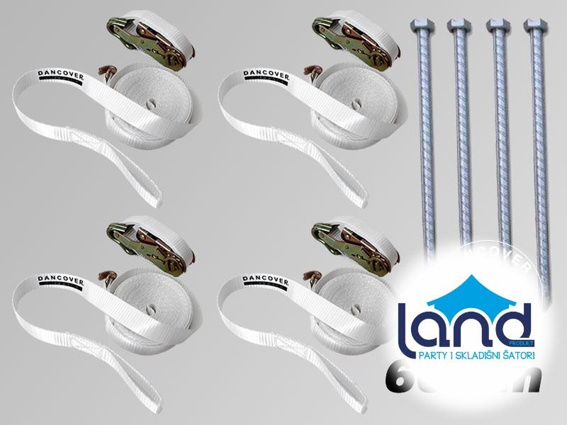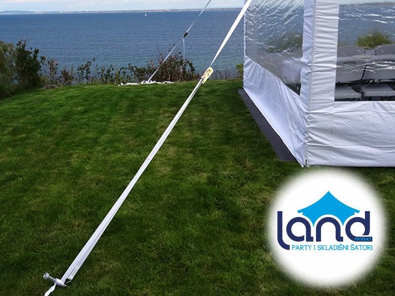 Sigurnosni Paket za šatore za zabave i općenito šatore. 4 klina za oluju (60 cm) i 4 bijele trake za oluju (25mmx8m) će osigurati vaš šator i brzopostavljivu sjenicu za vjetrovitog vremena.