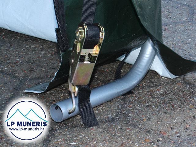 Garaža ima PE materijal od 260 g/m² koji je čvrsto pričvršćen na konstrukciju pomoću sustava užadi.