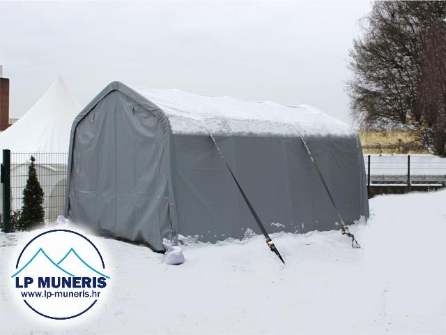 Garaža ima jaki PVC materijal od 550 g/m² koji je čvrsto pričvršćen na konstrukciju pomoću sustava užadi.