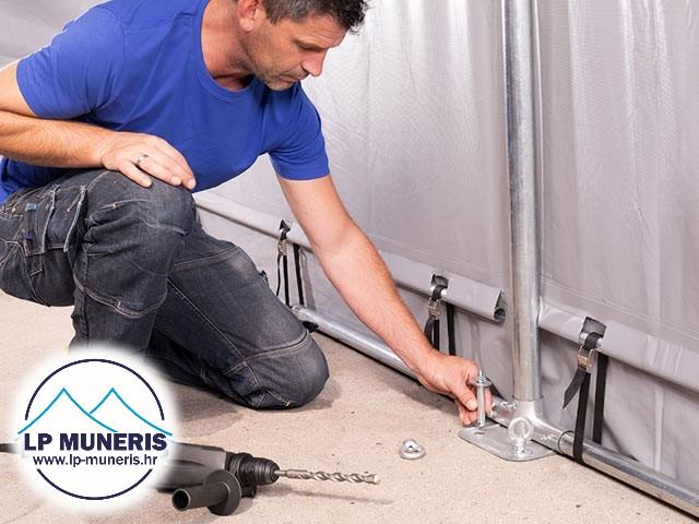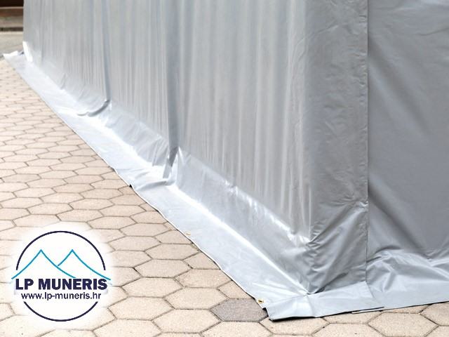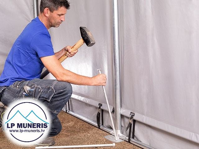 NAPOMENA: sa skladišnim šatorima koji su predviđeni za sva godišnja doba dolaze zatezne trake ( gurtne ) koje se prebacuju preko šatora nakon što se on postavi. Trake daju veću otpornost udarima vjetra.