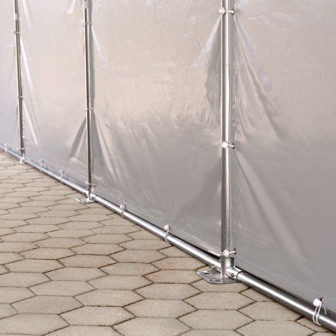 Izrazito robustan, sa podebljanom i pojačanom krovnom i podnom konstrukcijom te cijevima fi 50mm/fi 54mm, koje su potpuno pocinčane i zaštičene od korozije. Kroz rupe u cijevima, dijelovi spojnice čvrsto su spojeni vijcima i maticama. Šator se također može montirati na betonski temelj pomoću ekspanzijskih vijaka ako želite trajnije rješenje.