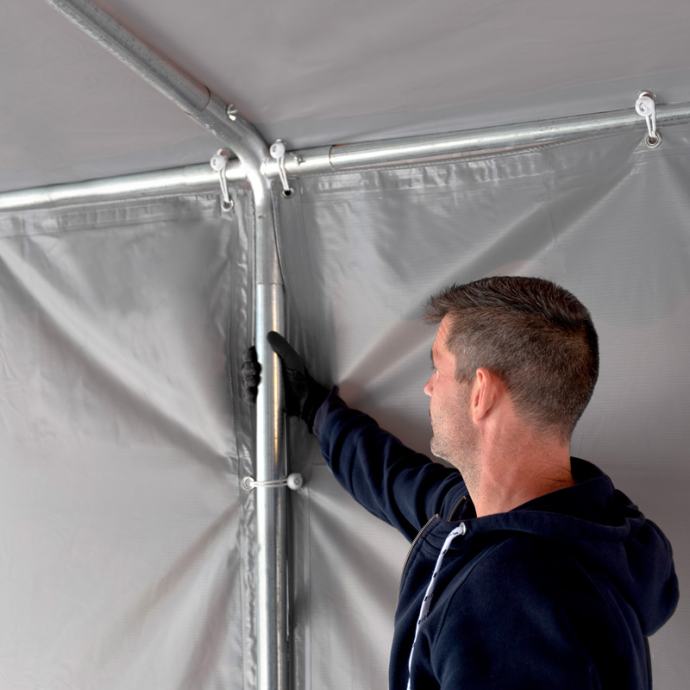 Izrazito robustan, sa podebljanom i pojačanom krovnom i podnom konstrukcijom te cijevima fi 50mm/fi 54mm, koje su potpuno pocinčane i zaštičene od korozije. Kroz rupe u cijevima, dijelovi spojnice čvrsto su spojeni vijcima i maticama. Šator se također može montirati na betonski temelj pomoću ekspanzijskih vijaka ako želite trajnije rješenje.