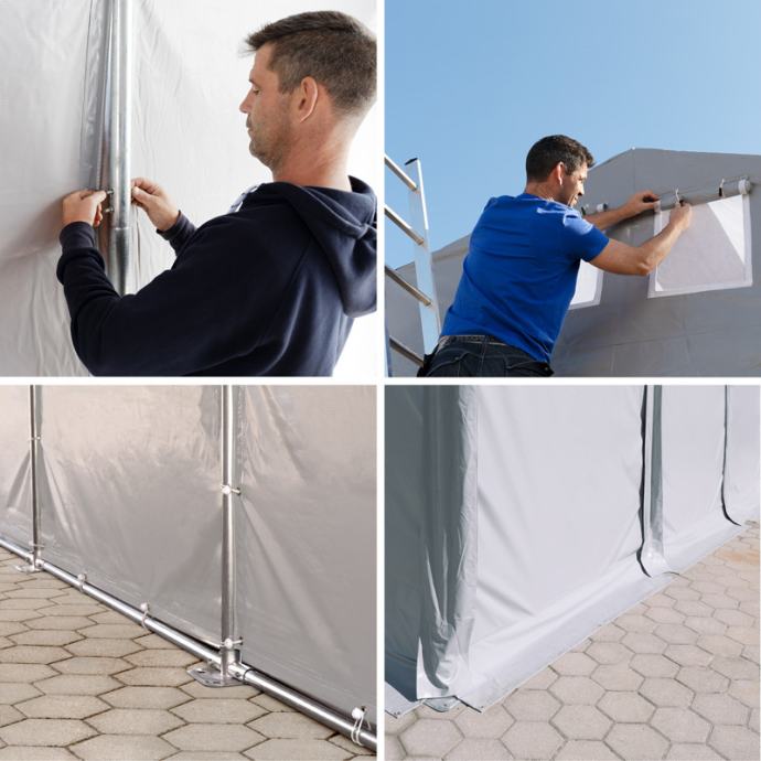 Pocinčane cijevi i jaka PVC cerada garantiraju dugi vijek trajanja. Professional linija čini gornju klasu naših skladišnih šatora i nudi različite visine ulaza, između 2 i 4 m. Ovi skladišni šatori su izrađeni od više čelika i stoga je širi promjer cijevi.