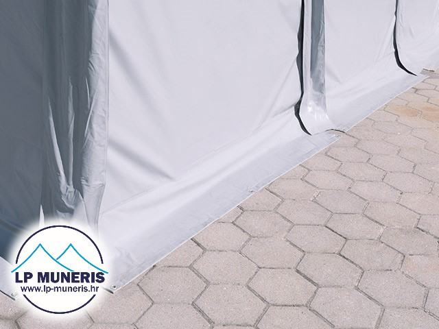 Izrazito robustan, sa podebljanom i pojačanom krovnom i podnom konstrukcijom te cijevima fi 50mm/fi 54mm, koje su potpuno pocinčane i zaštičene od korozije. Kroz rupe u cijevima, dijelovi spojnice čvrsto su spojeni vijcima i maticama. Šator se također može montirati na betonski temelj pomoću ekspanzijskih vijaka ako želite trajnije rješenje.