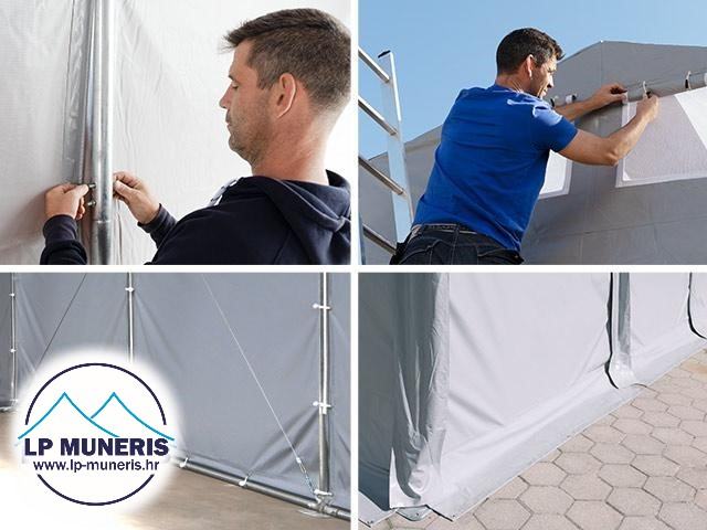 Izrazito robustan, sa podebljanom i pojačanom krovnom i podnom konstrukcijom te cijevima fi 50mm/fi 54mm, koje su potpuno pocinčane i zaštićene od korozije. Kroz rupe u cijevima, dijelovi spojnice čvrsto su spojeni vijcima i maticama. Šator se također može montirati na betonski temelj pomoću ekspanzijskih vijaka ako želite trajnije rješenje.