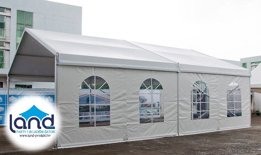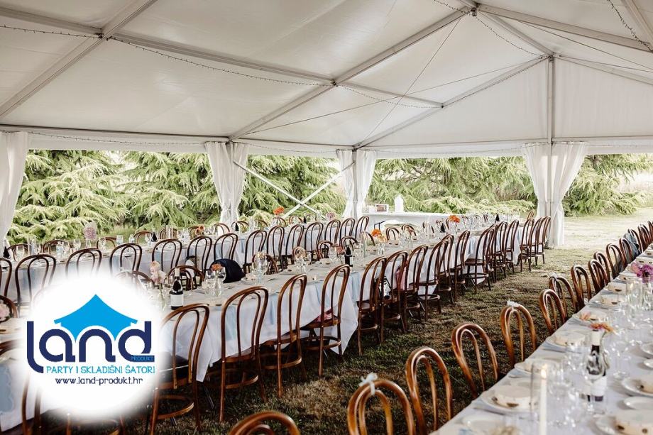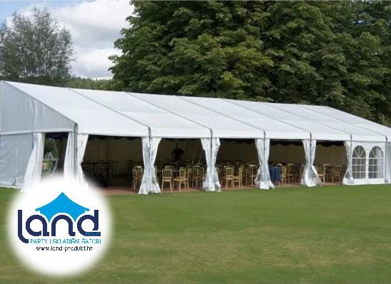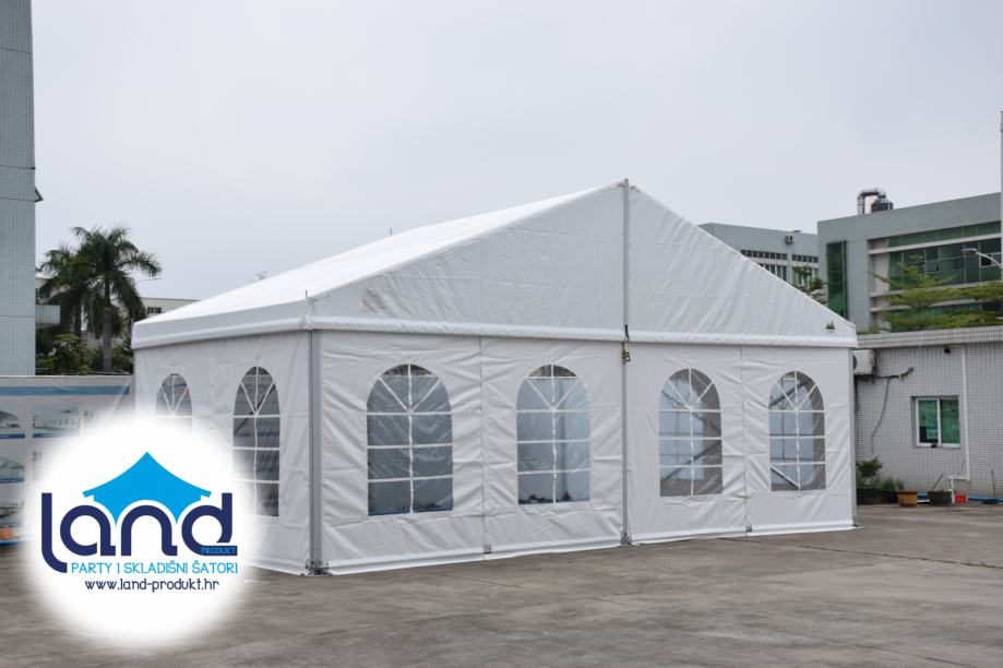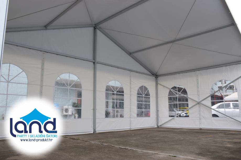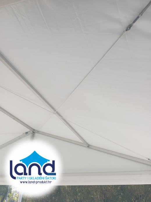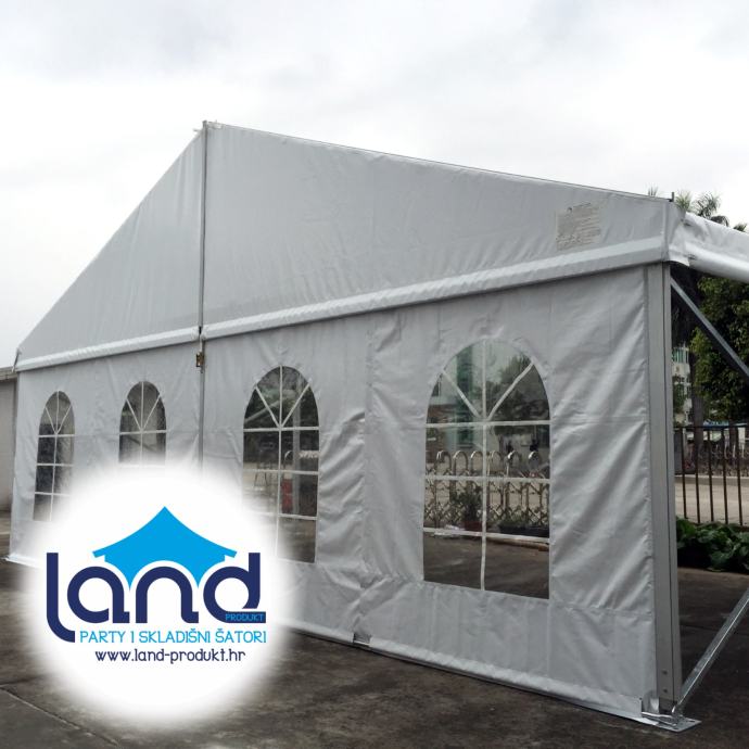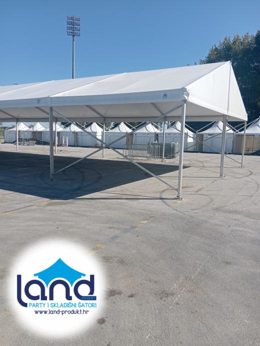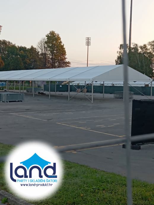 Prodaje se potpuno novi profesionalni party šator 10m x 30m sa sa svim stranicama. Bočne stranice su PVC cerade bez prozora isto kao i jedna dužna strana od 30 m, druga dužna strana je sa prozorima. Uz šator dolazi 32 klina promjera 25 mm i 65 cm dužine isto kao i ekspanzijski vijci. Najduža komponenta je oko 5,6 m. Procijenjeni volumen je 8 cbm. Šator posjeduje CE certifikat i rađen je po svim standardima EU.
