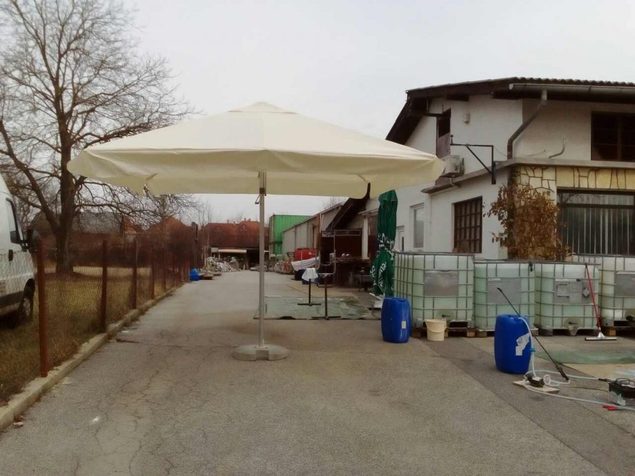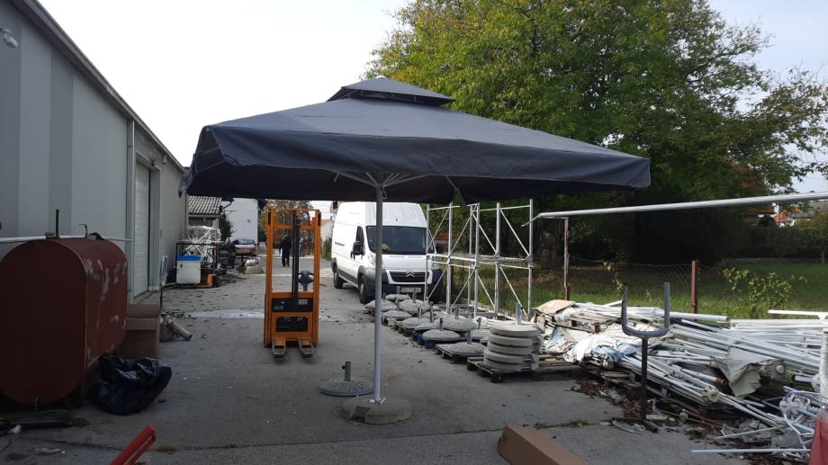 Ugostiteljski suncobrani 3.5x3.5 m ,obnovljena konstrukcija promjer cijevi 60 mm (stanje 8/10) + NOVO TOP KVALITETNO plano