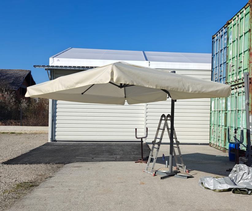 Ugostiteljski suncobrani 4x3 m sa bočnim nagibom ,obnovljena konstrukcija (stanje 8/10) + novo bež platno s