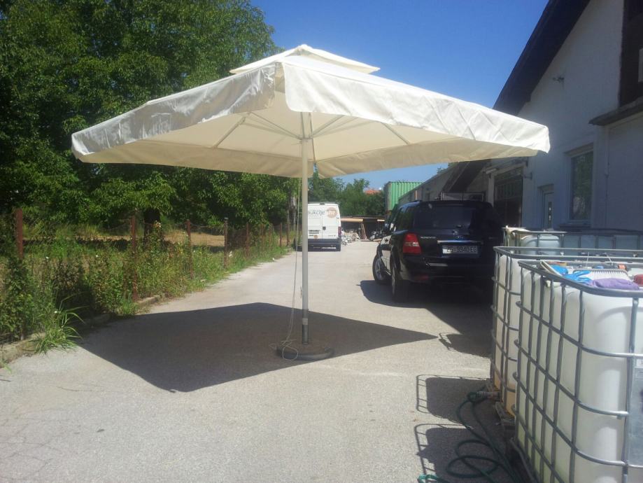 Ugostiteljski suncobrani 3.5x3.5 m , razne boje,rabljena konstrukcija i reklamno platno,korišteni par godina , dobro stanje 250 eur (stanje 6/10) ,(slika 6 informativno )