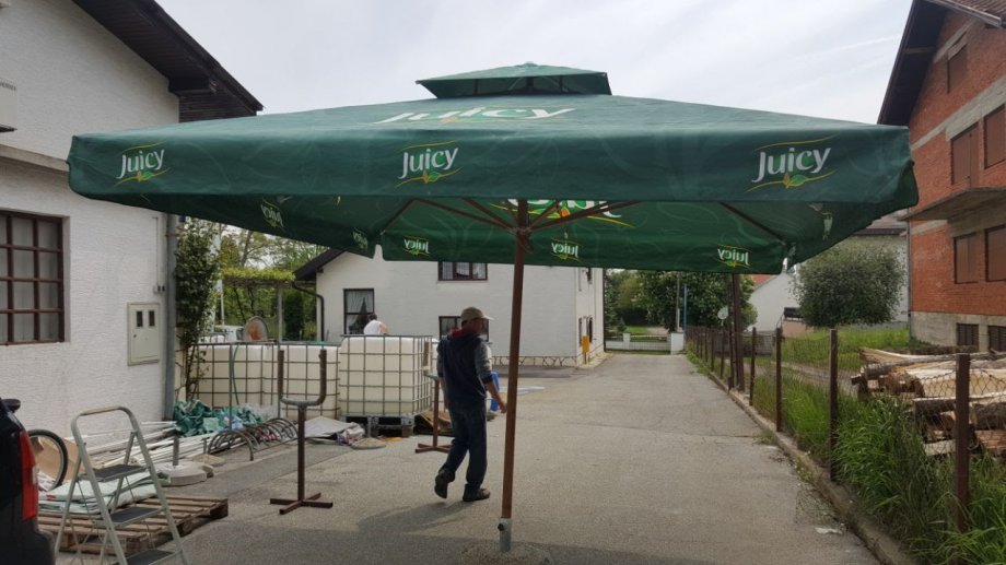 Ugostiteljski suncobrani 3.5x3.5 m ,obnovljena konstrukcija promjer cijevi 60 mm (stanje 8/10) + REKLAMNO platno staro cca 1,5 g