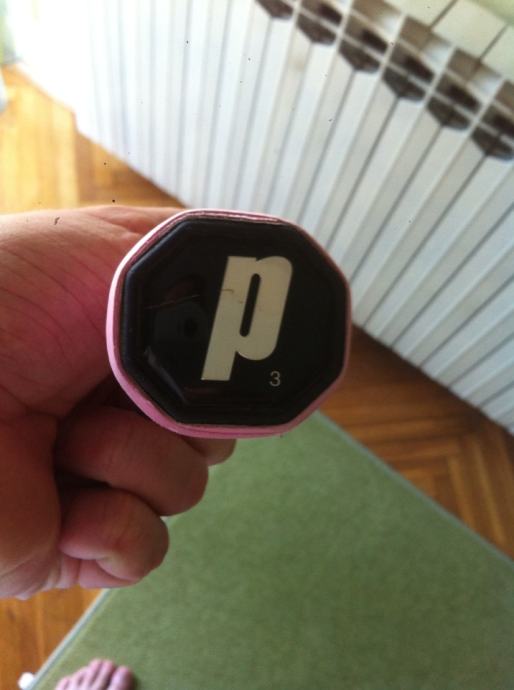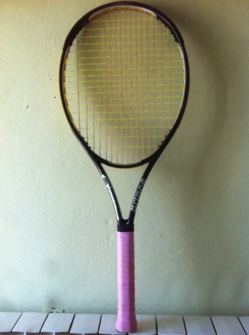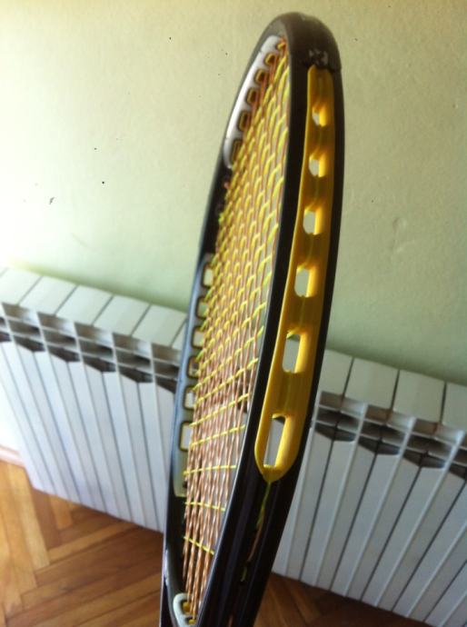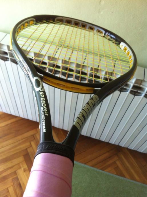 Reket Prince iz naslova, težina 280 gr. glava 100, ručka 3. Friško stavljene žice 25/24 kg