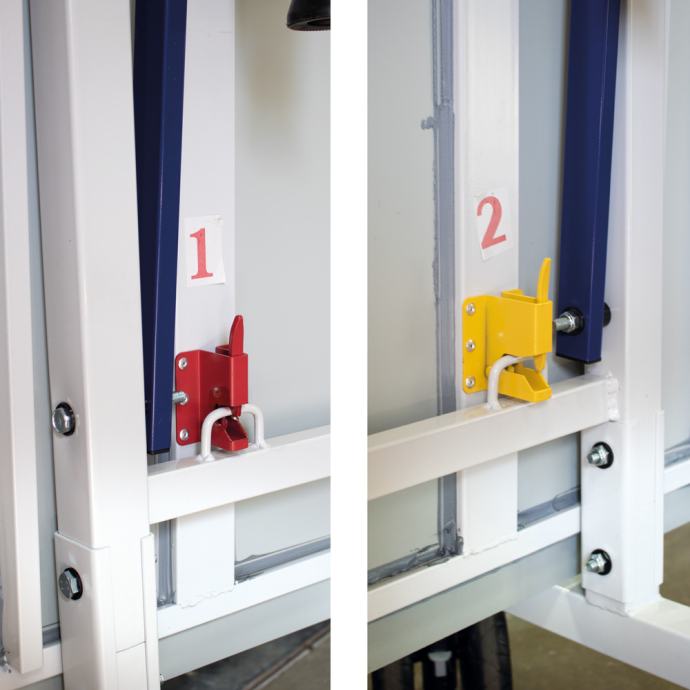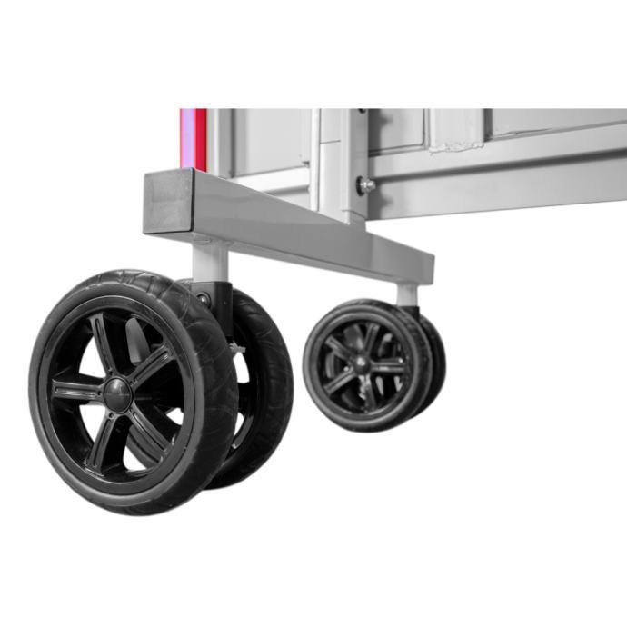 Svaka polovica stola ima dva osigurača kod preklopljenog položaja i 4 dupla kotača širine 15 cm koji se mogu zaključati za dodatnu sigurnost tijekom transporta i skladištenja