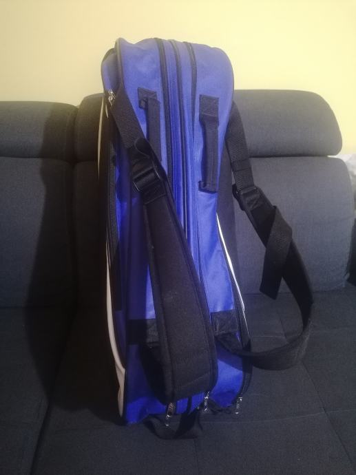 Ima dva velika pretinca za rekete i dva mala za patike i sitnice. Vidljivi su tragovi korištenja. Zatvarači su svi ispravni. Crno plave je boje.
