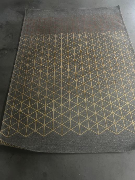 Tepih ima atraktivan geometrijski uzorak u tonovima sive, žute i narančaste, što ga čini odličnim dodatkom modernim, skandinavskim ili minimalističkim interijerima.
