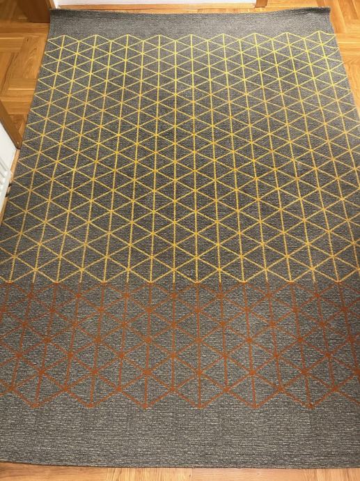 Tepih ima atraktivan geometrijski uzorak u tonovima sive, žute i narančaste, što ga čini odličnim dodatkom modernim, skandinavskim ili minimalističkim interijerima.