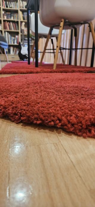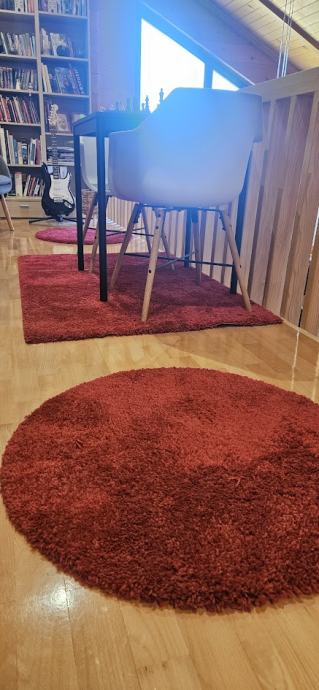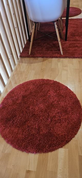 Prodajem dva okrugla tepiha - sintetički, s visokim florom, bordo, promjer 80 cm i jedan pravokutni dimenzija 57x110 cm.