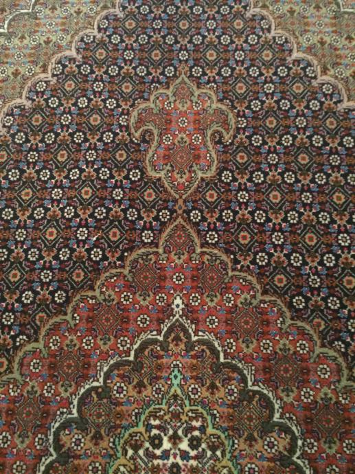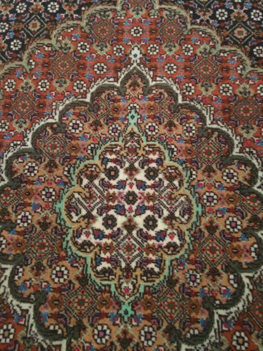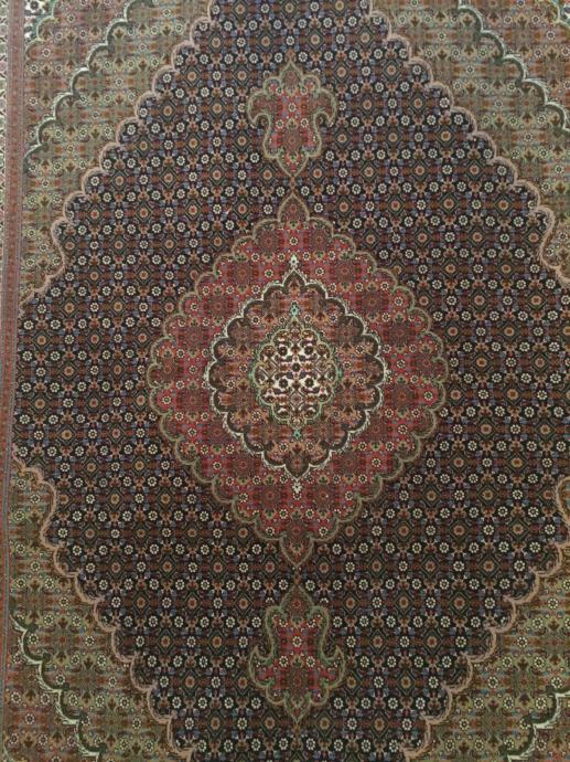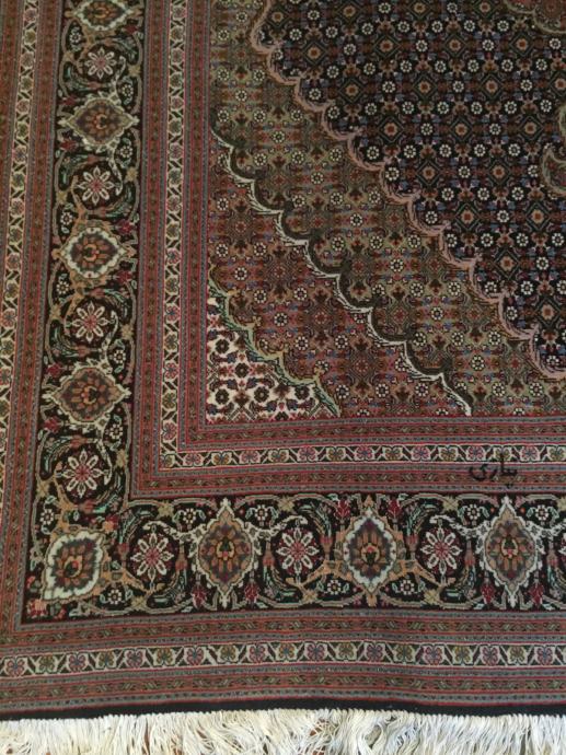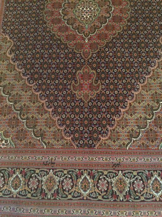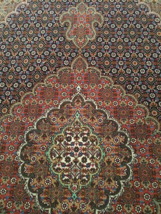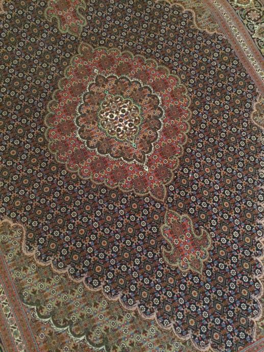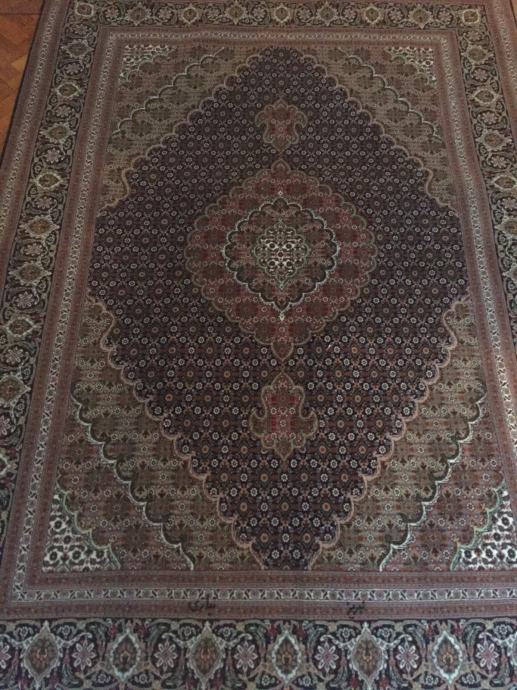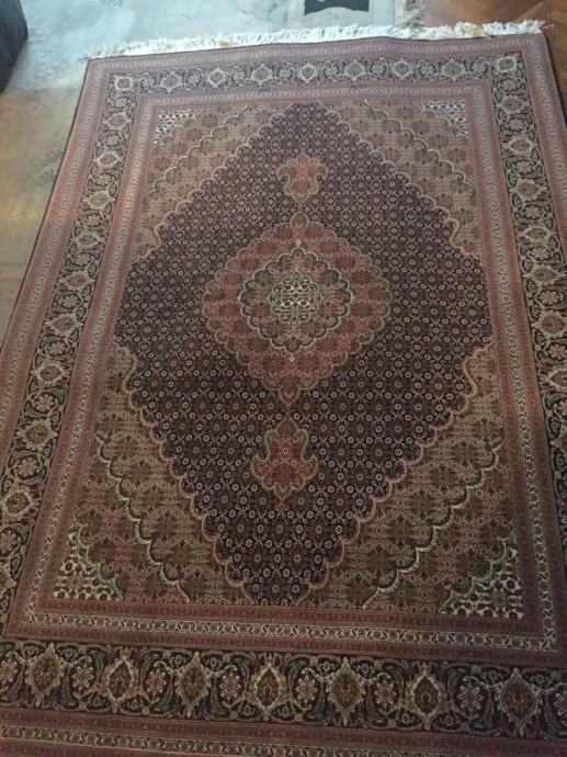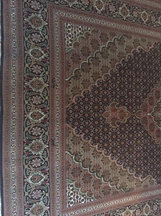 TABRIZ IRAN Perzijski vrlo efektan tepih lijepih nijansi bež smedjih i crvenih tonova sa karakterističnim motivom Tabriz tepiha...ručni rad ..mix prirodne vune i svile..prirodne boje..na licu tepiha utkan i potpis majstora izrade ...pozadina gotovo identična gornjištu tepiha...175cmX220 cm..kožna protuklizna traka ..nekorišten..