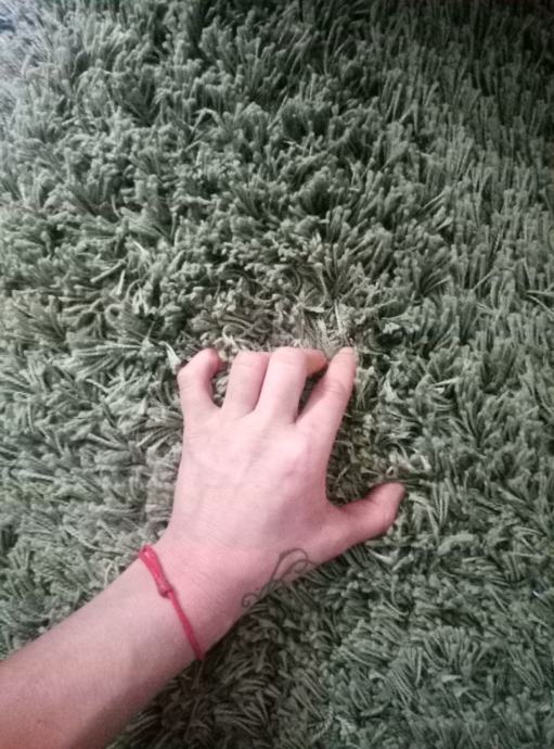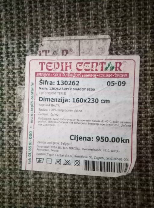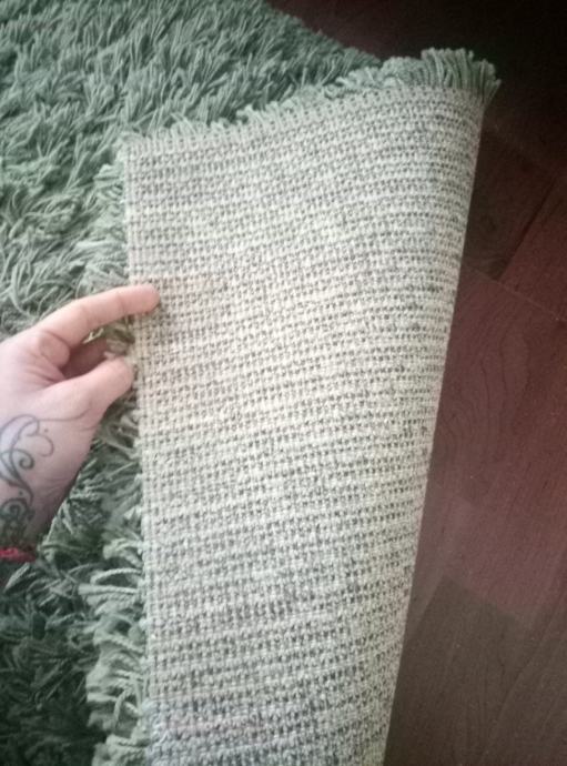 Dimenzije 160 x 230. Materijali vidljivi na priloženim fotografijama. Napomena, donji dio je kompaktno tkan - ne trusi se i ne klizi po glatkim površinama.