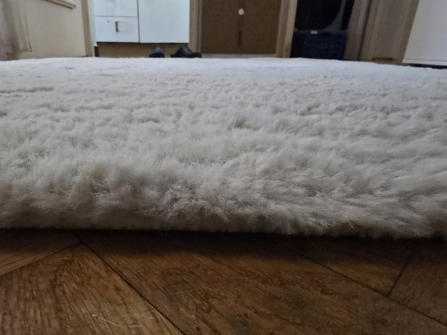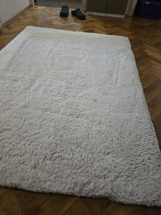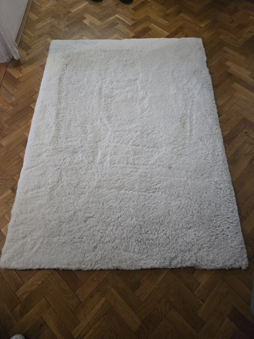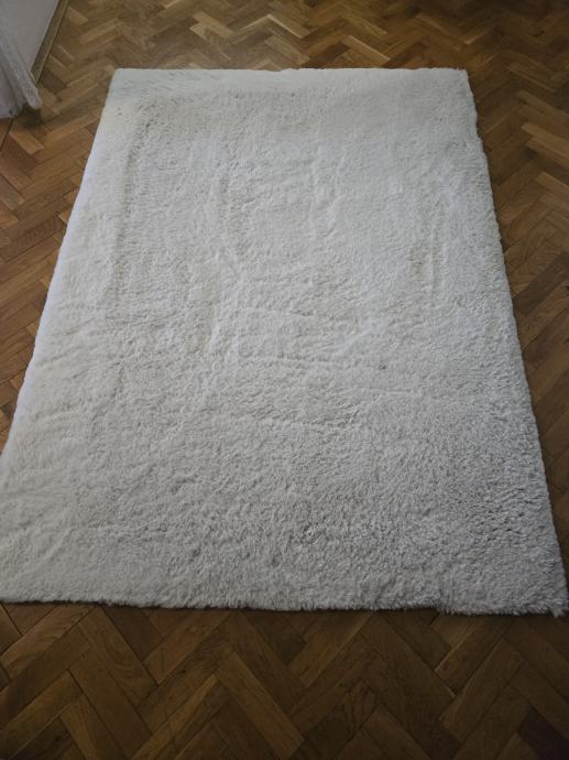 Tepih mekani i debeli,bijele boje,dimenzija 170x120cm. Korišten 4 mjeseca,kemijski očišćen i zapakiran,spreman za upotrebu.