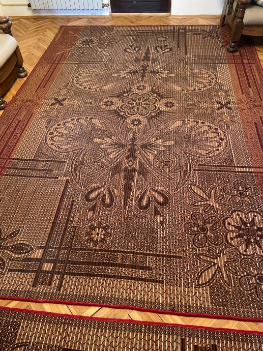 Prodajem tepih u smeđe-bordo kombinaciji boja s klasičnim orijentalnim uzorkom koji uključuje motive leptira, cvjetova i geometrijskih linija. Rubovi tepiha su bordo crvene boje, dok je središnji dio u toplim smeđim tonovima. Tepih je dimenzija 340x240 cm, prikladan za dnevni boravak.
