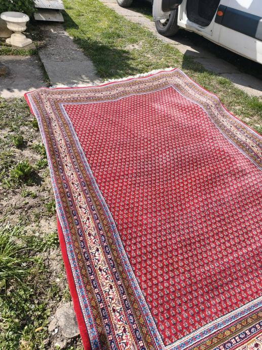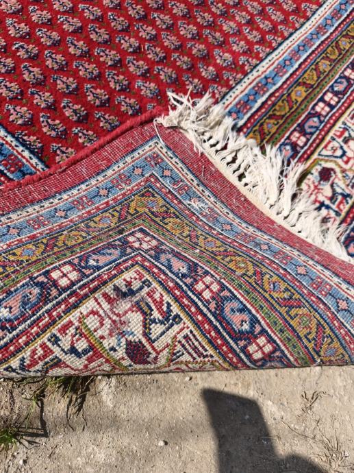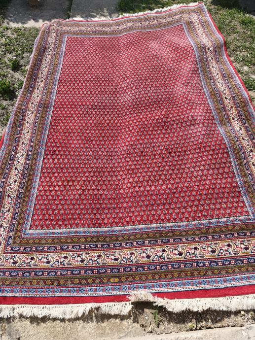 Prodajem tepih orijentalne izrade u crvenoj boji s gustim sitnim uzorkom po cijeloj površini. Rub tepiha ukrašen je višerednom bordurom s motivima životinja i biljnih ornamenata u nijansama plave, zlatne, bež i crvene boje. Na krajevima se nalaze rese. Tepih je velikih dimenzija, prikladan za dnevni boravak ili blagovaonicu.