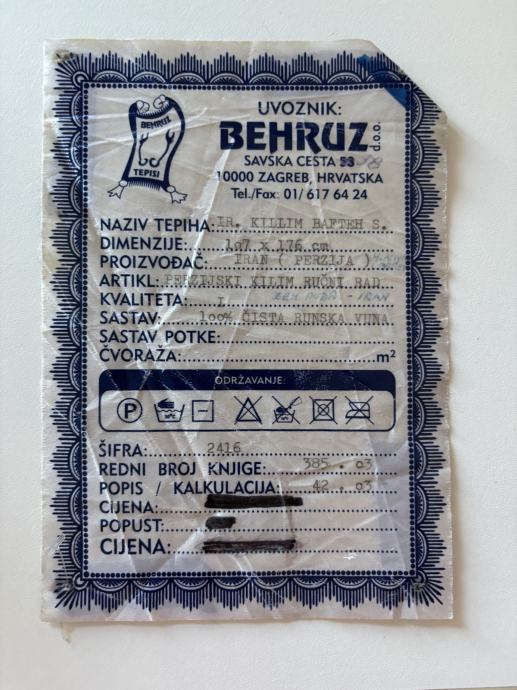 Tepih - Perzijski ćilim - kupljen prije nekoliko godina od ovlastenog uvoznika u Zagrebu (Behruz d.o.o). Izraden u Iranu od ciste runske vune posebnom tehnikom uzlanja, sto ga cini cvrstim, lijepim i jedinstvenim.