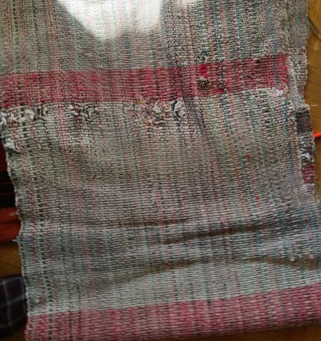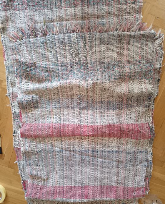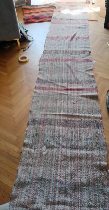 Tkani tepih, nije baš u najboljem stanju, vidi se da je krpan na više mjesta, ali ako slučajno može nekom poslužiti za selo ili slično. Dimenzija cca 320x56. Imam još nekoliko ovakvih po simboličnoj cijeni.