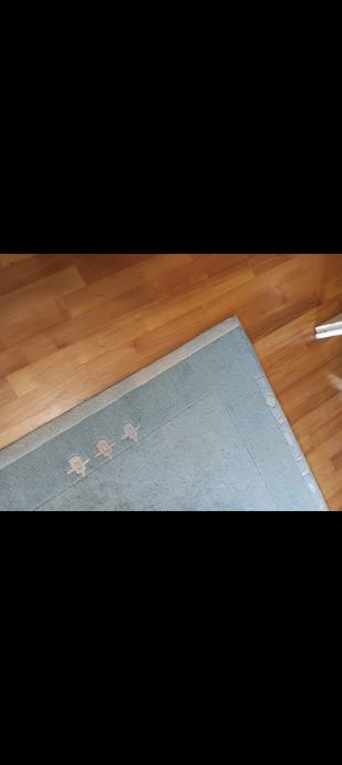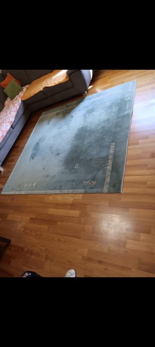 Vuneni tepih 200×200 cm. Vide se ulegnuća od stolića i taburea, ali se oni daju češkom vratiti u prvobitno položaj.