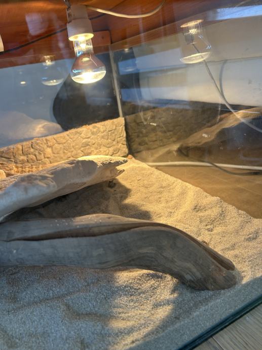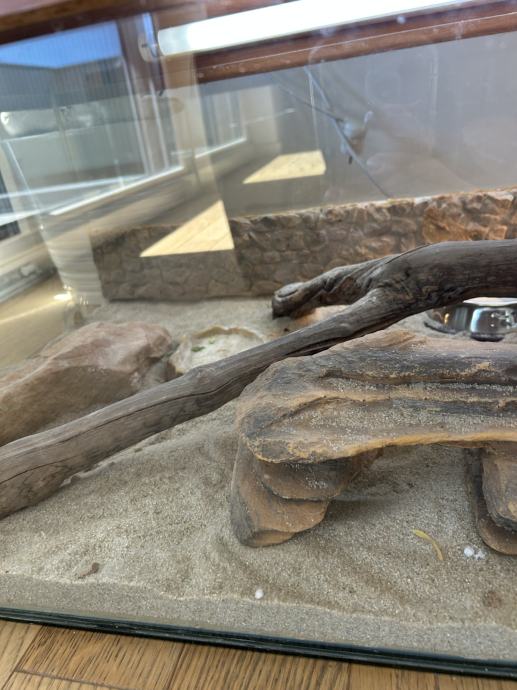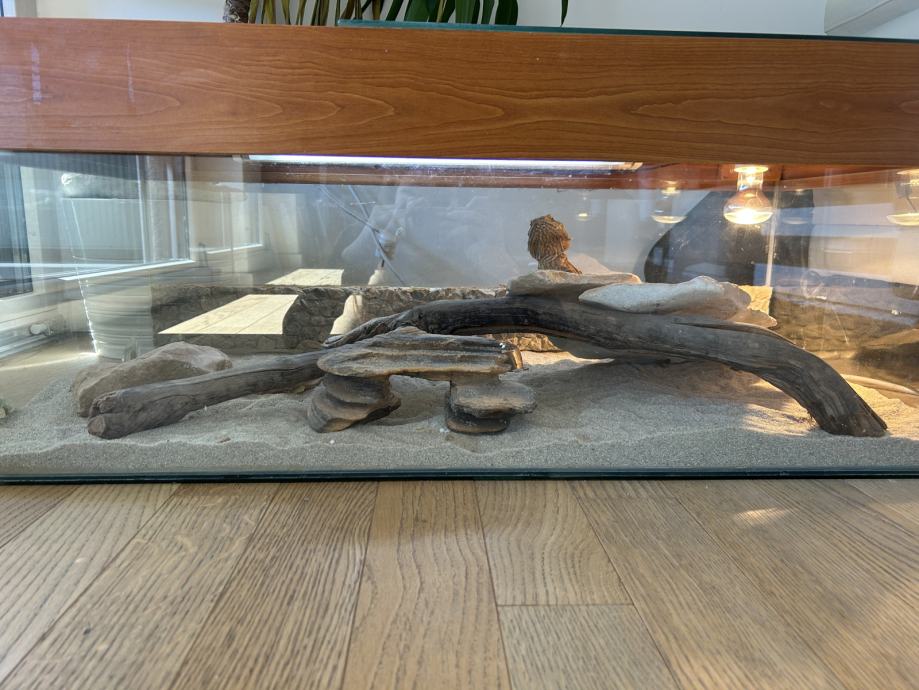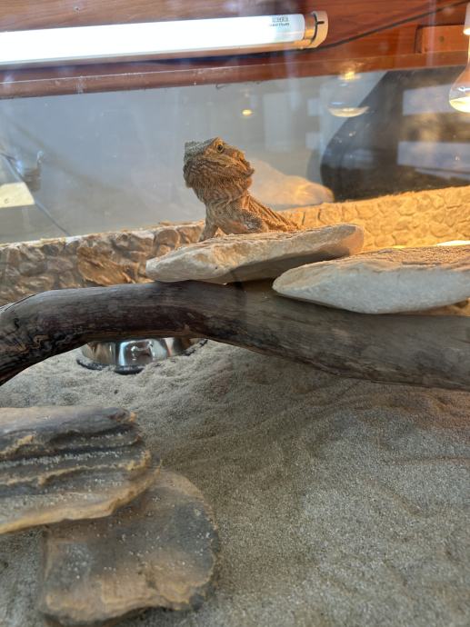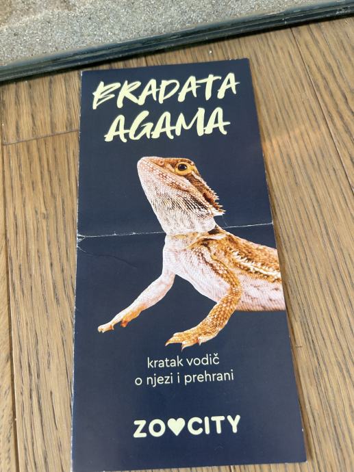 Bradata agama srtara 4 godine i u potpunosti uređen terarij, uz nju se dobije posuda s hranom, kalcij i kalcij+vitamin d, ukras, pinceta za hranjenje, bočica za ovlaživanje terarija i vodič u kojem možete otkriti svašta o svojem novom kućnom ljubimcu