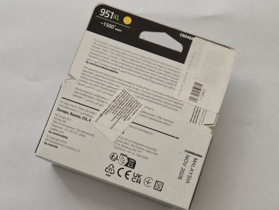 Prodajem HP 951XL yellow (žutu) tintu. Novo, nekorišteno. Kupljeno u 02/2026, plaćeno 67EUR (račun). Tvorničko jamstvo do 11/2026.