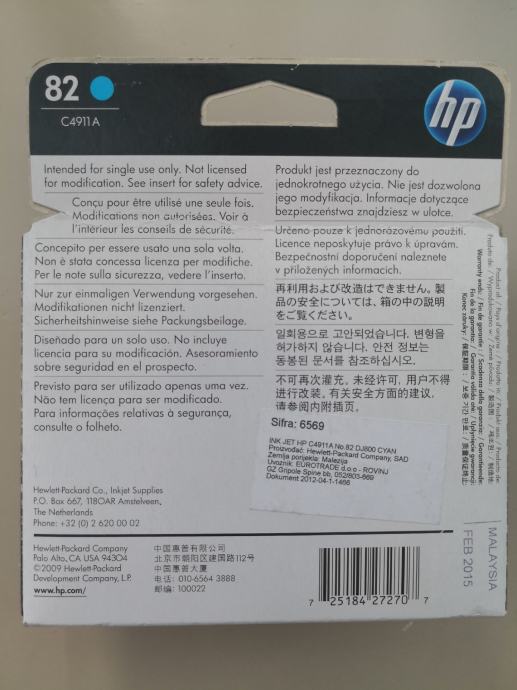 HP Ink Jet C4911A No.82 Cartridge DJ800 Cyan 43€ po komadu. Komada 4.
