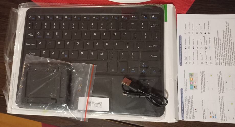 Uz tipkovnicu dolazi USB C kabel za punjenje, stalak za tipkovnicu koji omogućuje podešavanje nagiba iste te upute za upotrebu.