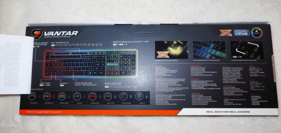 Cougar Vantar je odlično dizajnirana i prilagodljiva gamerska žična tipkovnica. Odlikuju je jednostavan dizajn, preciznost i visoka učinkovitost. Opremljena je s 19 glavnih tipki s tehnologijom Anti-ghosting. Ima mogućnost 8 različitih osvjetljenja koja. Tipkovnica se i dalje može pohvaliti Scissors tipkama što ju čini gotovo nečujnom prilikom tipkanja.