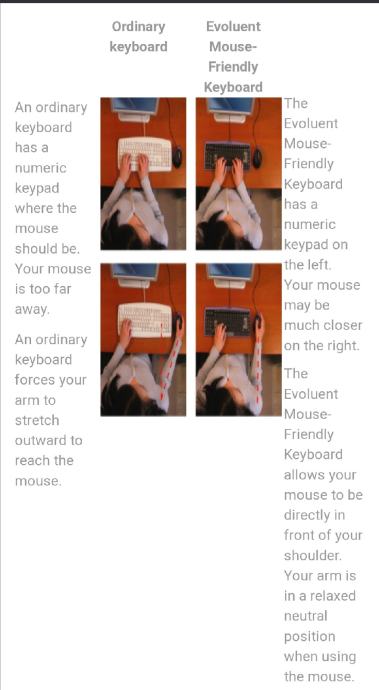 Numerička tipkovnica je premještena na lijevu stranu kako bi omogućila da ruka bude u neutralnom položaju prilikom korištenja miša.