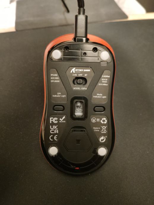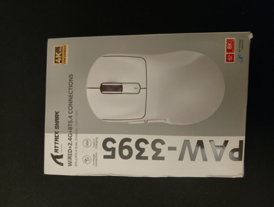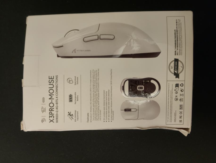Kupljen u 11 mjesecu 2024., dodatni ultraglide klizači. Bluetooth, 2.4g, žično spajanje. 26000dpi, odozdola se podešava. Ima softver za podešavanje.