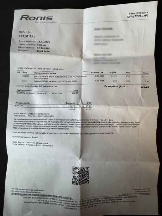 Prodajem Logitech G Pro X Superlight 2 bežični gaming miš, kupljen 15.01.2026. u Ronisu (račun prilažem).