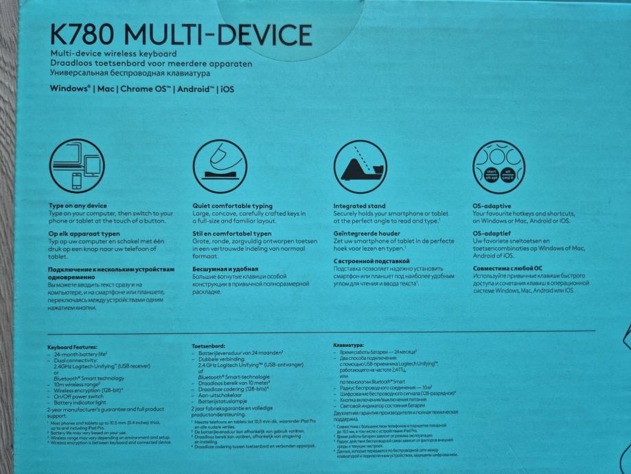 Jedinstvena značajka K780 je ugrađeni nosač koji drži pametne telefone i tablete pod savršenim kutom za gledanje i tipkanje. Ova praktična funkcija omogućuje učinkovit rad i organizaciju uređaja na radnoj površini.