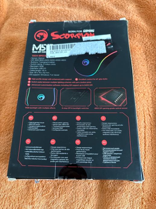 Prodajem Marvo Scorpion RGB gaming miš, model M513, potpuno nov i neotpakiran. Miš dolazi s RGB osvjetljenjem, ima 4800 DPI rezoluciju i programabilne tipke. Ergonomski je oblikovan za udobnost tijekom dugotrajnijeg korištenja. Opremljen je preciznijim senzorom i kontrolom DPI-ja u više razina. Dodatno nudi 3 milijuna klikova izdržljivosti prekidača.
