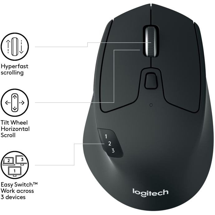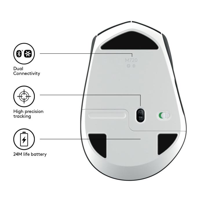 PC connectivity: Wireless Bluetooth Smart and 2.4GHz connection Mouse type: optical Interface: USB Unifying Range: up to 10 m Number of buttons: 8 Resolution: 1,000 dpi Color: Black Packing type: Retail Optional: Easy and fast switching during use on 3 different computers, right-handed design, Hyper-Fast scrolling, 1x AA battery (life up to 24 months) Web link to the manufacturer: http://www.logitech.com/en-us/product/m720-triathlon
