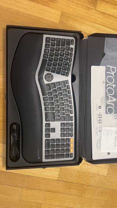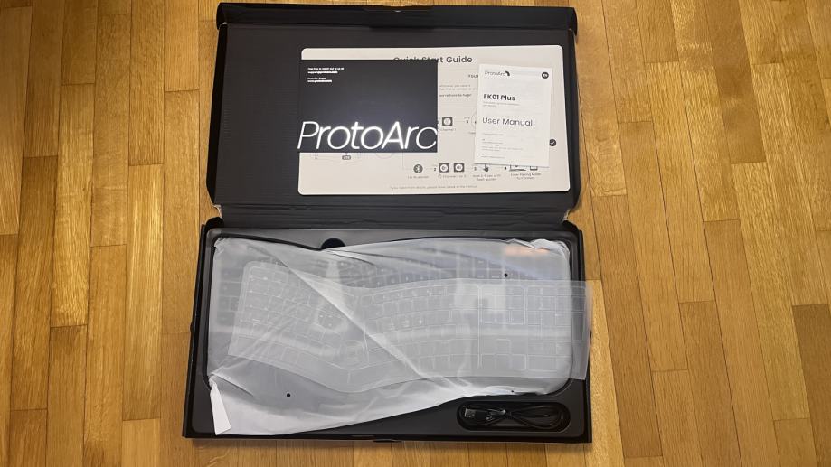 ProtoArc EK01 Plus ergonomic keyboard je bežična, ergonomski dizajnirana tipkovnica s podijeljenim (split) rasporedom tipki koja smanjuje napor zapešća i poboljšava držanje tijekom dugotrajnog tipkanja. Ima mekane bijele LED pozadinsko osvjetljenje s nekoliko razina osvjetljenja, ugrađenu naslon-za-zapešće i 2000 mAh bateriju s dugim trajanjem. Povezuje se putem Bluetootha i 2.4 GHz USB prijemnika te omogućuje brzo prebacivanje između do tri uređaja. USB-C punjenje čini je praktičnom za svakodnevnu upotrebu na računalu, laptopu ili tabletu