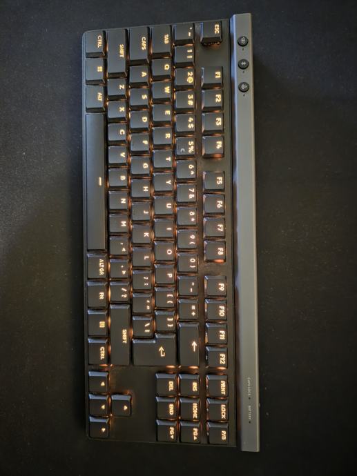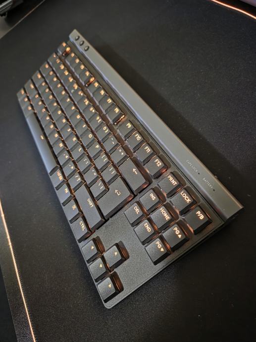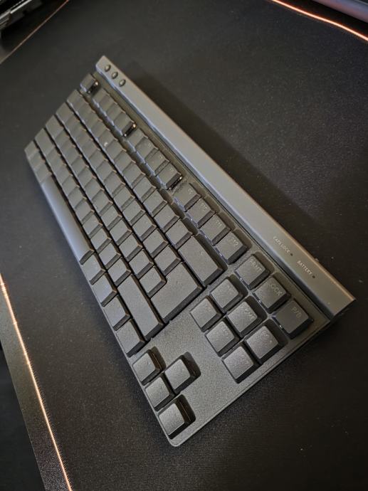 Tipkovnica ima niskoprofilne GL mehanicke prekidace brown swittcheve, pbt tipke, svjetlosnu LED oznaku za trajanje baterije i Caps Lock, brzo USB-C punjenje, hotkeys za Lightspeed, Bluetooth nacin igre itd.